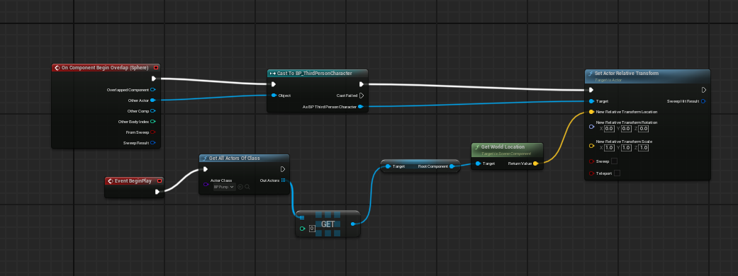 게임이 시작하자마자 해당 Actor Class를 모두 찾는다. Actor의 갯수가 여러개일 수 있으니 배열로 찾아 저장한다, 저장한 배열의 타겟의 world Location으로 값을 가져오면 BP_Pump가 있는 곳으로 순간이동 할 수 있다.