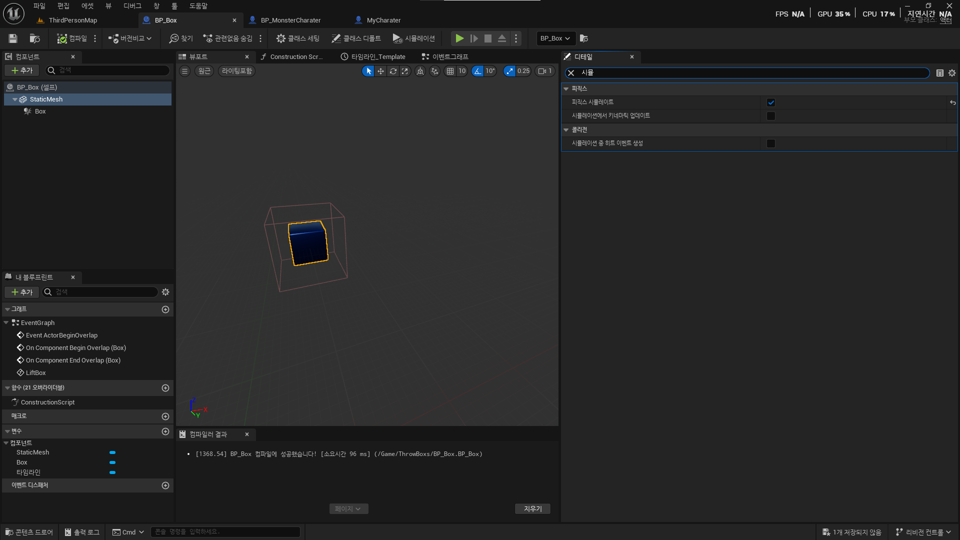 BP_Box의 스테틱 메쉬 디테일 패널에 시뮬레이션을 체크하여 시뮬레이션을 적용해 준다.