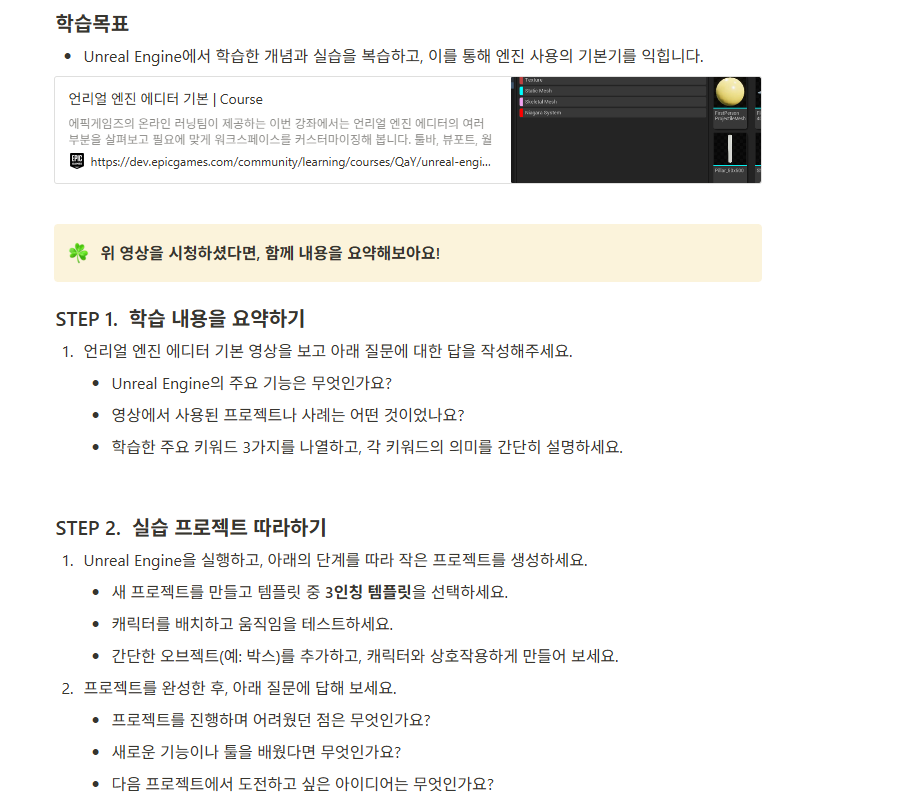 언리얼 엔진 기본 영상 요약언리얼 엔진 강의1. Unreal Engine의 주요 기능?Unreal Engine은 게임뿐만 아니라 영화, 애니메이션, 건축 시각화 등 다양한 분야에서 활용되는 실시간 3D 콘텐츠 제작 도구입니다.강력한 그래픽 렌더링, 블루프린트 시각적 스크립팅, 멀티플랫폼 지원, 시네마틱 연출 기능 등을 통해 개발자와 아티스트 모두에게 최적화된 작업 환경을 제공합니다.2. 영상에서 사용된 프로젝트나 사례?영상에서는 언리얼 엔진의 기본 인터페이스 설명을 위해 기본 레벨 프로젝트를 사용했습니다.간단한 구조물과 바닥 지형, 플레이어 캐릭터가 포함된 씬을 활용하여 뷰포트 조작, 액터 배치, 콘텐츠 브라우저 사용법 등을 시연했습니다.3. 학습한 주요 키워드 3가지와 설명키워드설명Viewport언리얼..